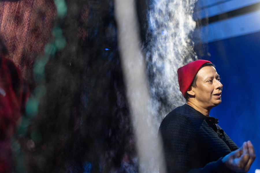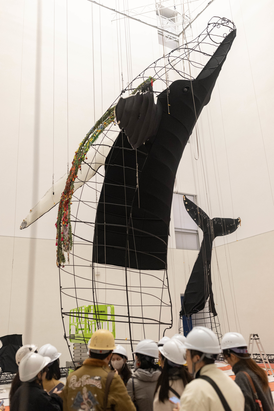 为了展现两头鲸鱼之间的壮丽问候,艺术家坚持完全按照真实尺寸制作这组鲸鱼艺术装置,从而带来了这件迄今为止艺术家创作生涯中规模最大的装置作品,艺术家以繁复的刺绣、珠饰、织物再现了它们身上的标记,同时将高约34米的中央展厅转化为一个沉浸式的水下领地,在人类与“巴特曼”和“阿莉亚”之间开启了一扇传送门,让它们“现身”展厅现场“讲述”自己的海洋故事。