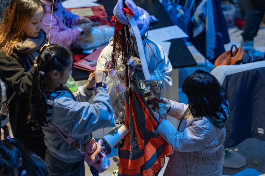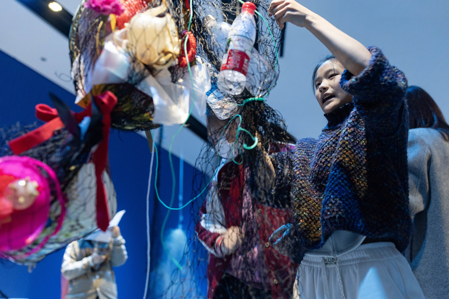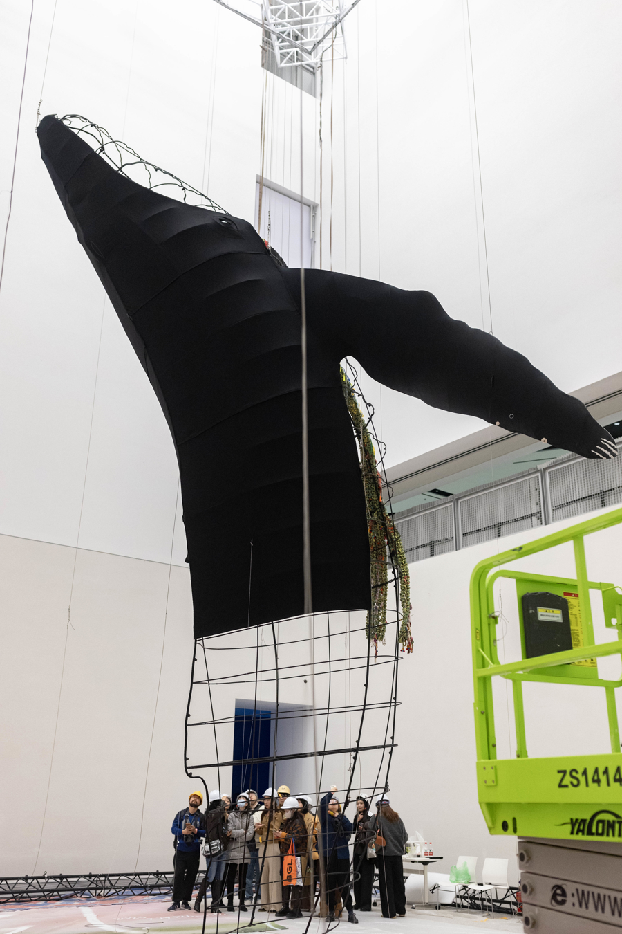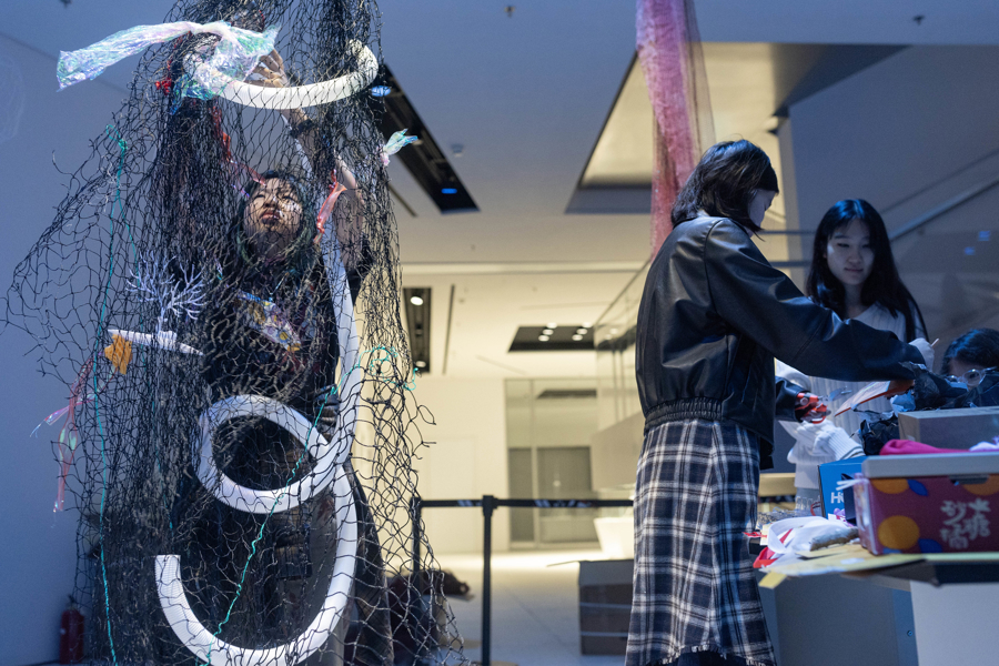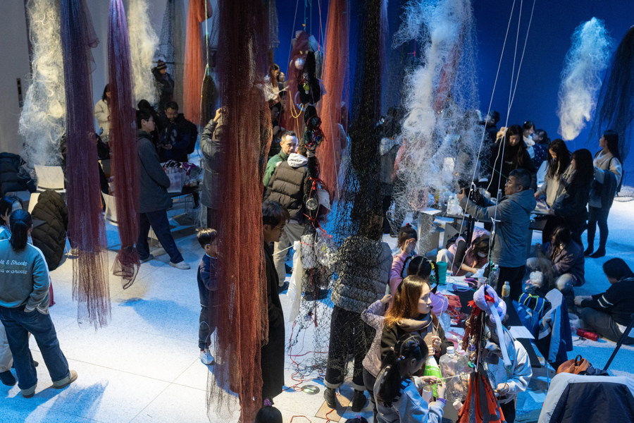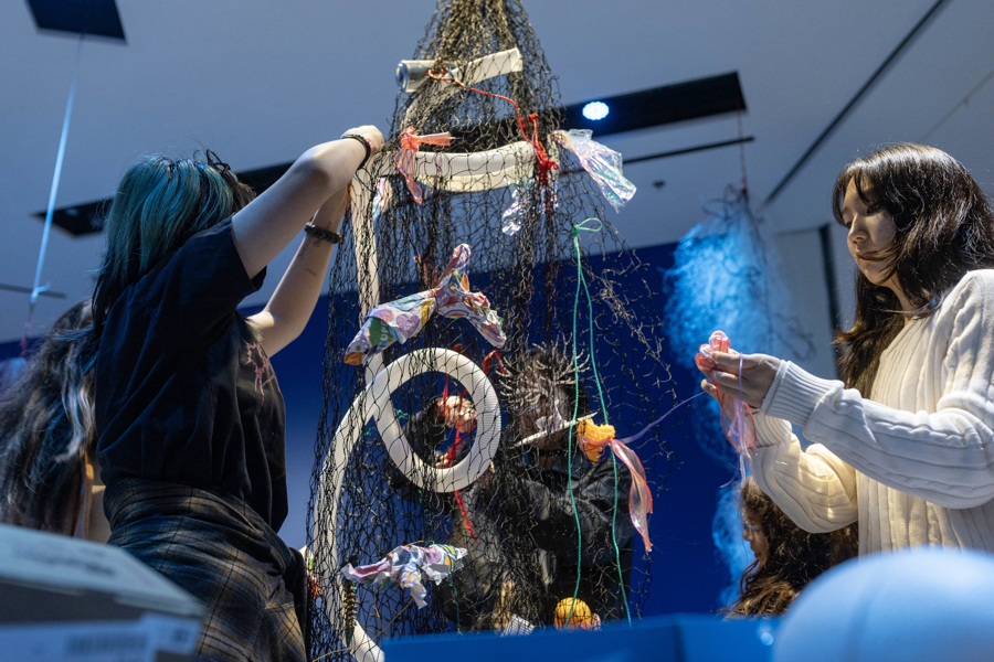 当天,展览艺术家卡罗莱娜·凯塞多来到浦东美术馆B1展厅,与来自上海多所学校的学生共同完成装置作品“幽灵网”的现场创作,该作品是“鲸鱼的致敬”的衍生装置,以废弃渔网为主要材料。在B1空间中,艺术家与学生围绕回收渔网展开协作,通过剪裁、缠绕、打结与连接,将渔网与拾得材料一同固定、组合,逐渐形成数件体量各异的雕塑作品。