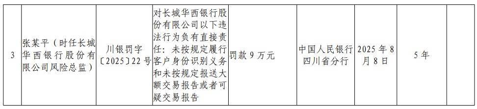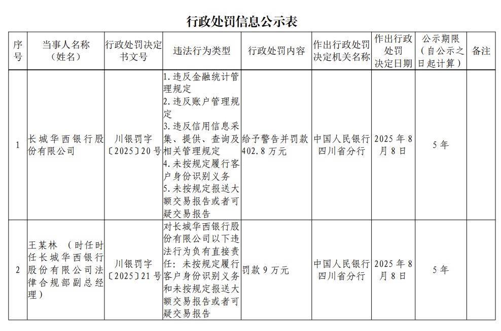 8月15日,中国人民银行四川省分行公布的一则行政处罚信息引发市场关注。长城华西银行因违反金融统计管理、账户管理、信用信息采集、客户身份识别及大额交易报告等多项规定,被监管部门予以警告并处罚款402.8万元。此外,时任法律合规部副总经理王某林和风险总监张某平因未履职被分别罚款9万元。